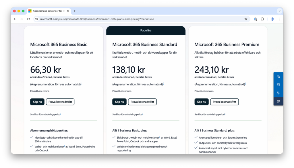 💡 Tips: Business-planerna är tillgängliga för organisationer med upp till 300 användare. Är ni fler än så behöver ni välja en av Enterprise-planerna istället.