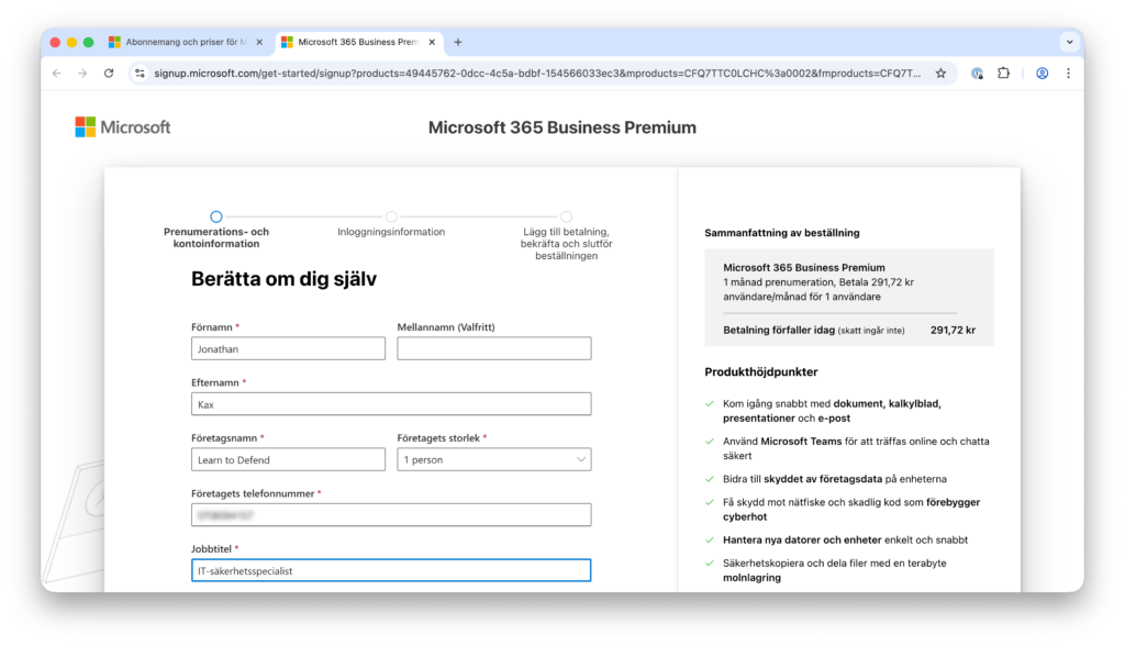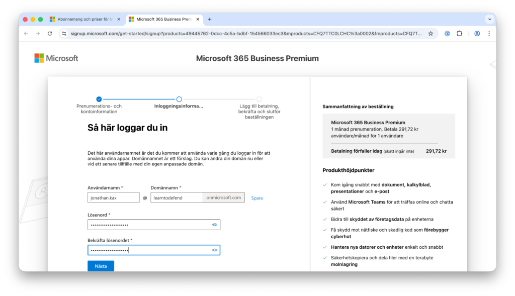 Nästa steg är att skapa din tenant, alltså själva grunden till din Microsoft 365-miljö.