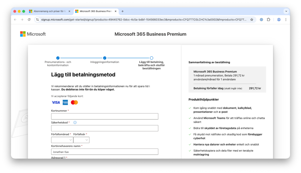 1. Sista steget är att lägga till betalningsmetod. Fyll i kortuppgifter och klicka på Spara.