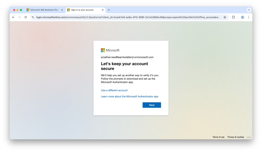 När du loggar in första gången kommer Microsoft automatiskt att be dig ställa in multifaktorautentisering (MFA). På sidan ”Let’s keep your account secure” klickar du på Nästa för att starta guiden.
