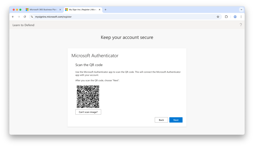 3. I installationsguiden visas en QR-kod på skärmen. Skanna den med Authenticator-appen för att koppla ihop kontot.
