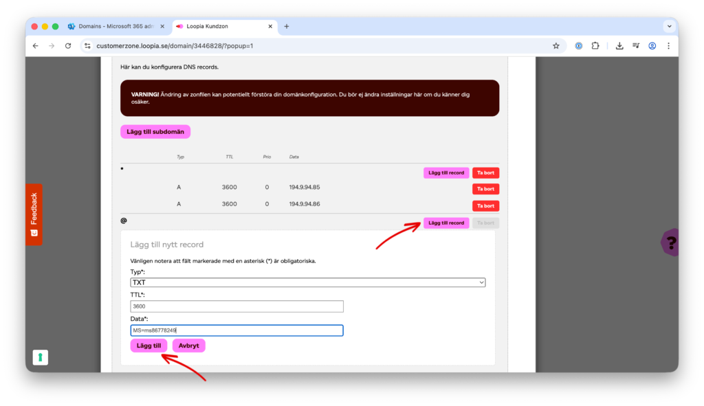 💡 Tips: På bilden nedan visas hur man lägger till en TXT-post via Loopia. Gränssnittet kan se annorlunda ut beroende på vilken DNS-leverantör du använder, men principen är densamma.
