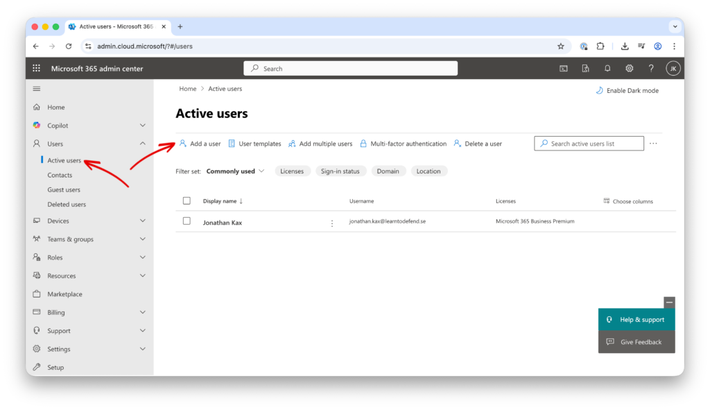 När tenanten och domänen är på plats är det dags att lägga till användare.