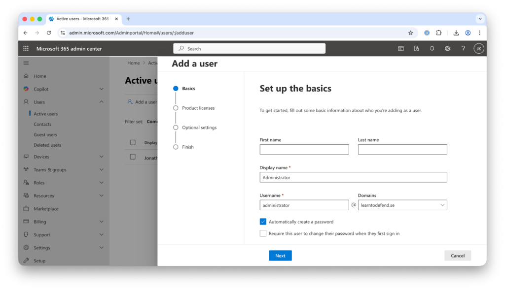 💡 Tips: I mitt fall sätter jag upp en labbmiljö och kommer bara använda detta konto för administration. Därför väljer jag ”Create user without product license (not recommended)”. I en produktionsmiljö är det däremot bra att även tilldela administratörskontot en licens, så att det kan skicka och ta emot mejl vid behov.